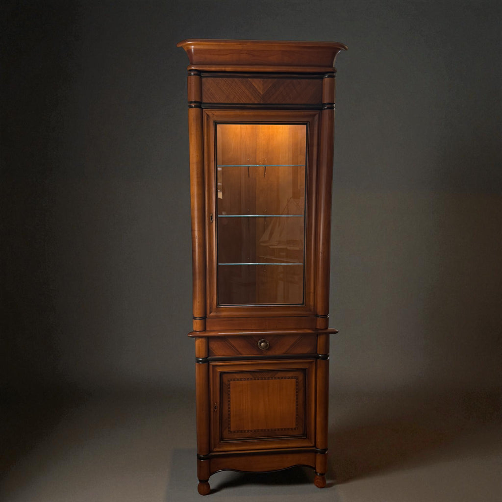 This exquisite corner cabinet exemplifies timeless craftsmanship through its thoughtful marriage of cherry and walnut woods. The warm glow of cherry wood harmonizes with the depth of walnut, creating a sophisticated aesthetic that transcends design trends and complements any interior palette. Three adjustable shelves behind the glass door invite you to curate and display your most treasured possessions with grace. A solid wood door provides concealed storage for everyday items, while a generous drawer adds practical refinement. Built using traditional carpentry methods, this handcrafted piece is engineered to endure as a cherished heirloom. Secured with an elegant brass key and lock, it stands as a testament to enduring quality and understated luxury.
