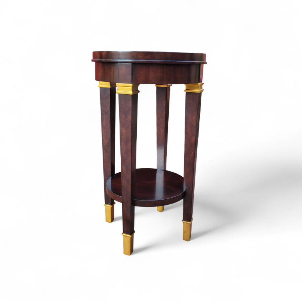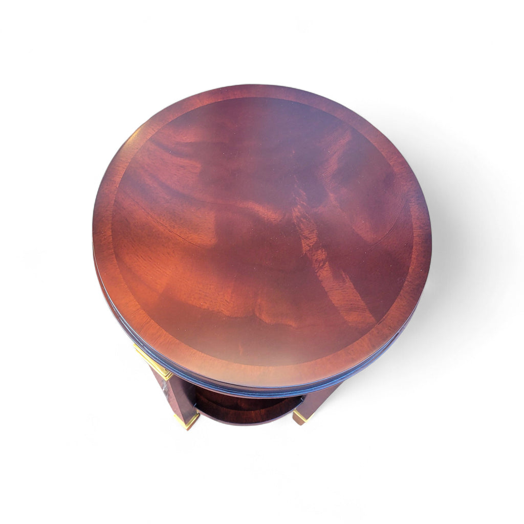 This petite mahogany round accent table made with riche mahogany and brass. This small piece makes big impressions in both the contemporary and traditional designs.